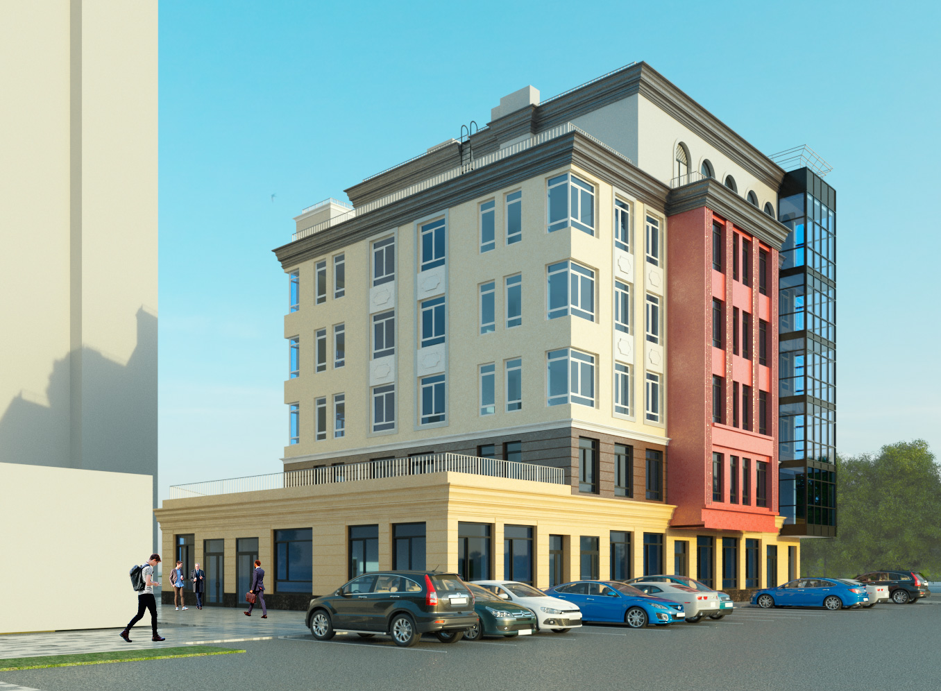 Простые геометрические формы, вытянутые в высоту окна, наличие арочных окон, увеличенная высота этажей, классические элементы, такие как пилястры и карнизы, спокойная цветовая гамма оштукатуренных поверхностей, отделанных гранитом, говорят о применении мотивов классического стиля, и таким образом увязывают здание с существующей застройкой ЖК "Шесть Звёзд".