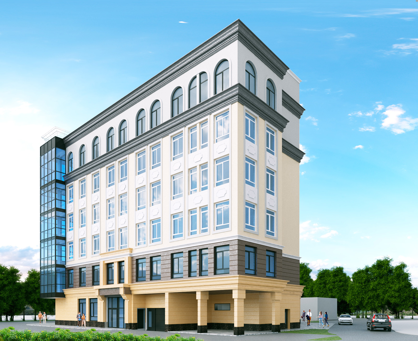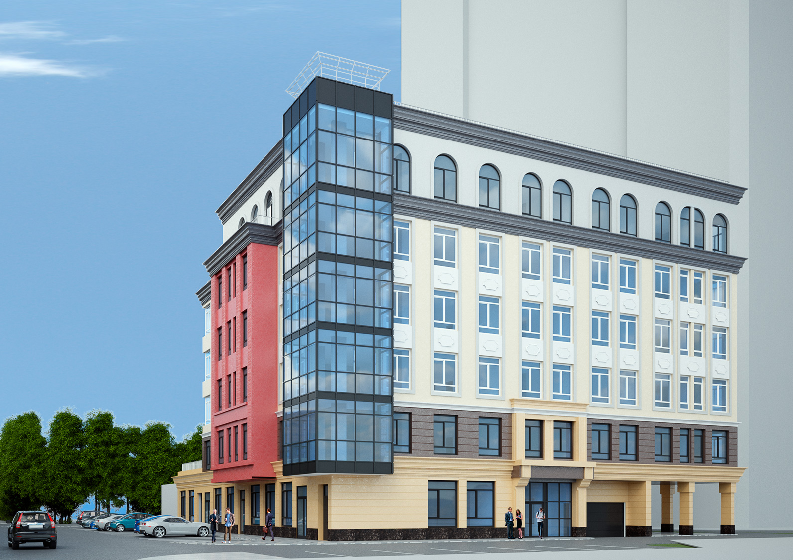 В основе композиции фасадов здания лежит классический стиль в современном исполнении. Фасадам придают строгость и изысканность горизонтальные членения карнизами и вертикальные полосы витражного остекления.
